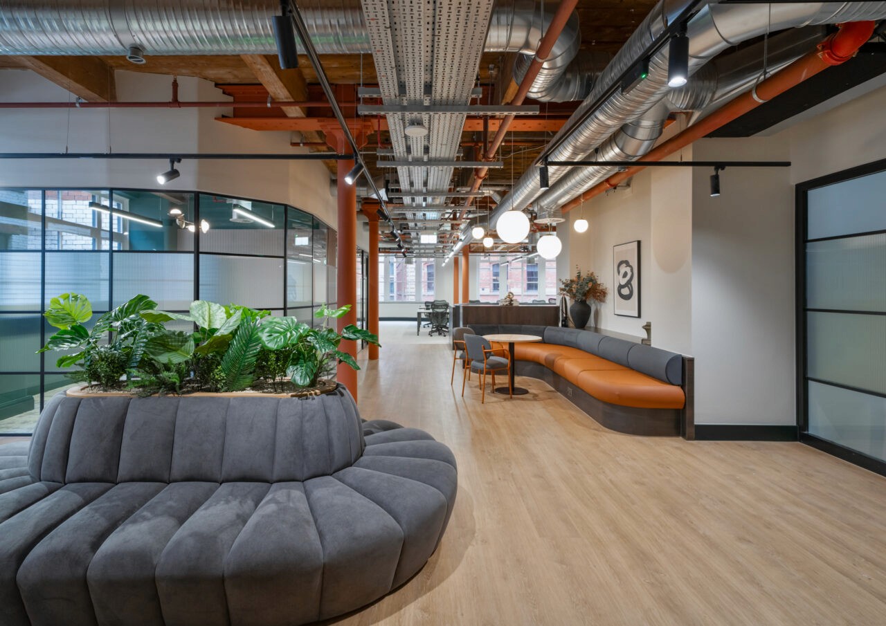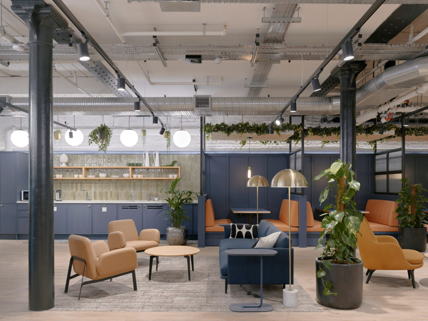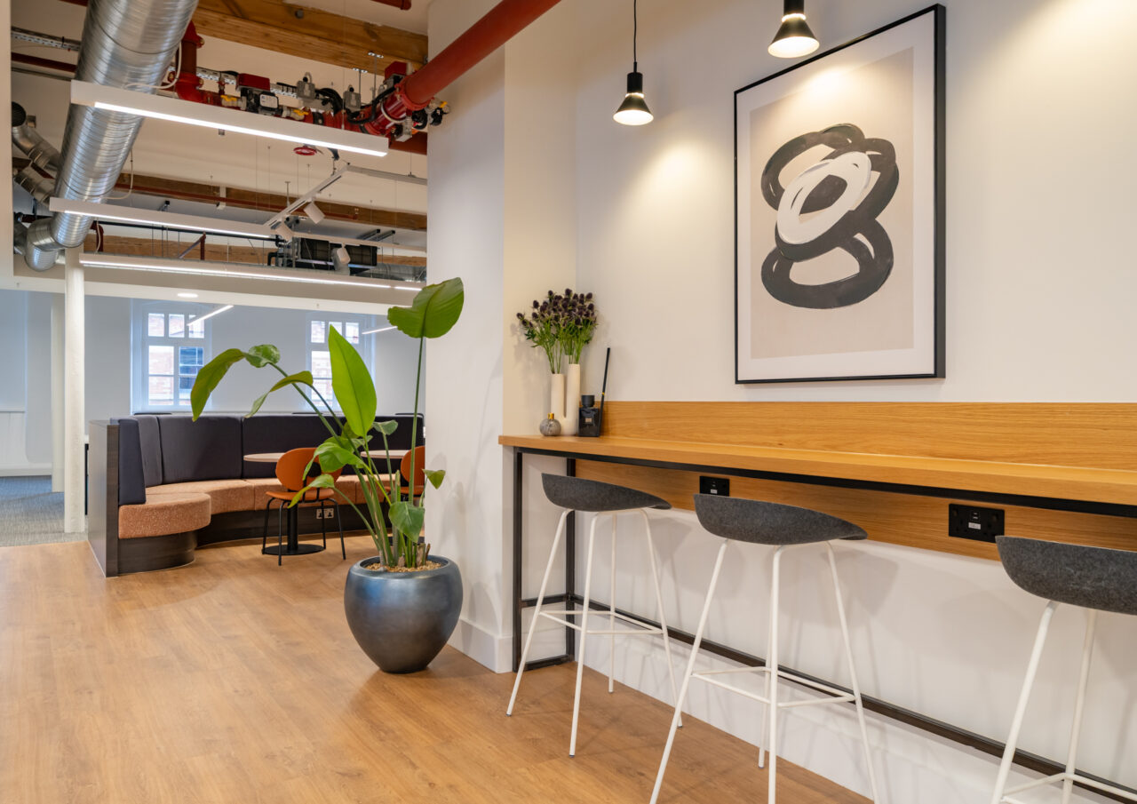 We designed and installed bespoke suspended planting rigs around the acoustic panels above the booth seating, specified and procured decor elements to enhance shelving and storage spaces, and curated a selection of artwork for the various areas of the office space.