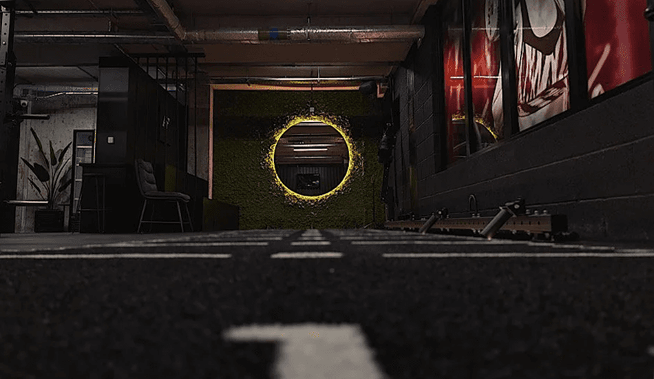 Black steel frameworks, rubber flooring and matte finishes were balanced with softer interventions, including timber slatted wall panels and integrated planting, which introduced warmth and contrast against the otherwise industrial palette. Branded graphics and backlit visuals further enhanced identity, creating a cohesive and recognisable environment.