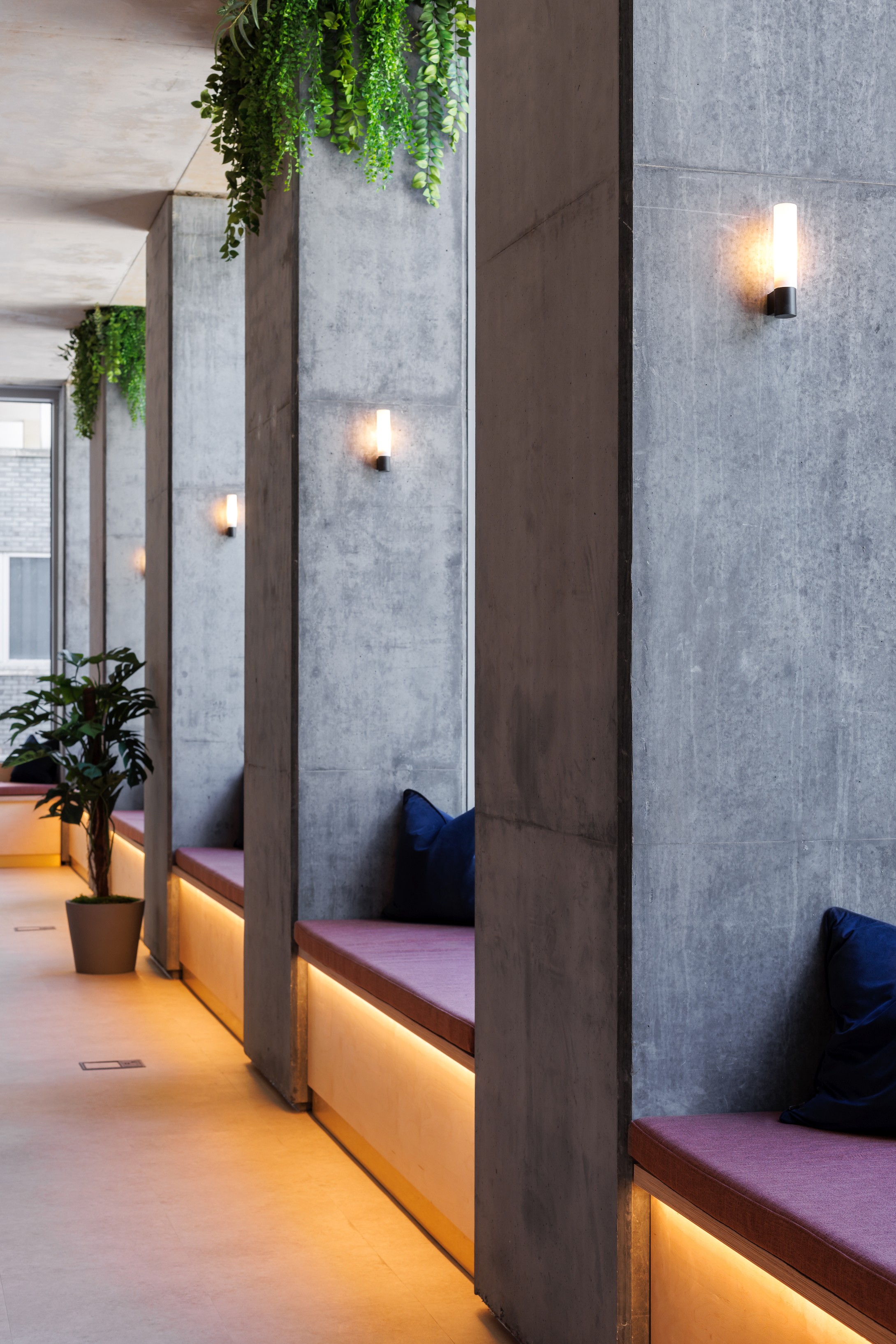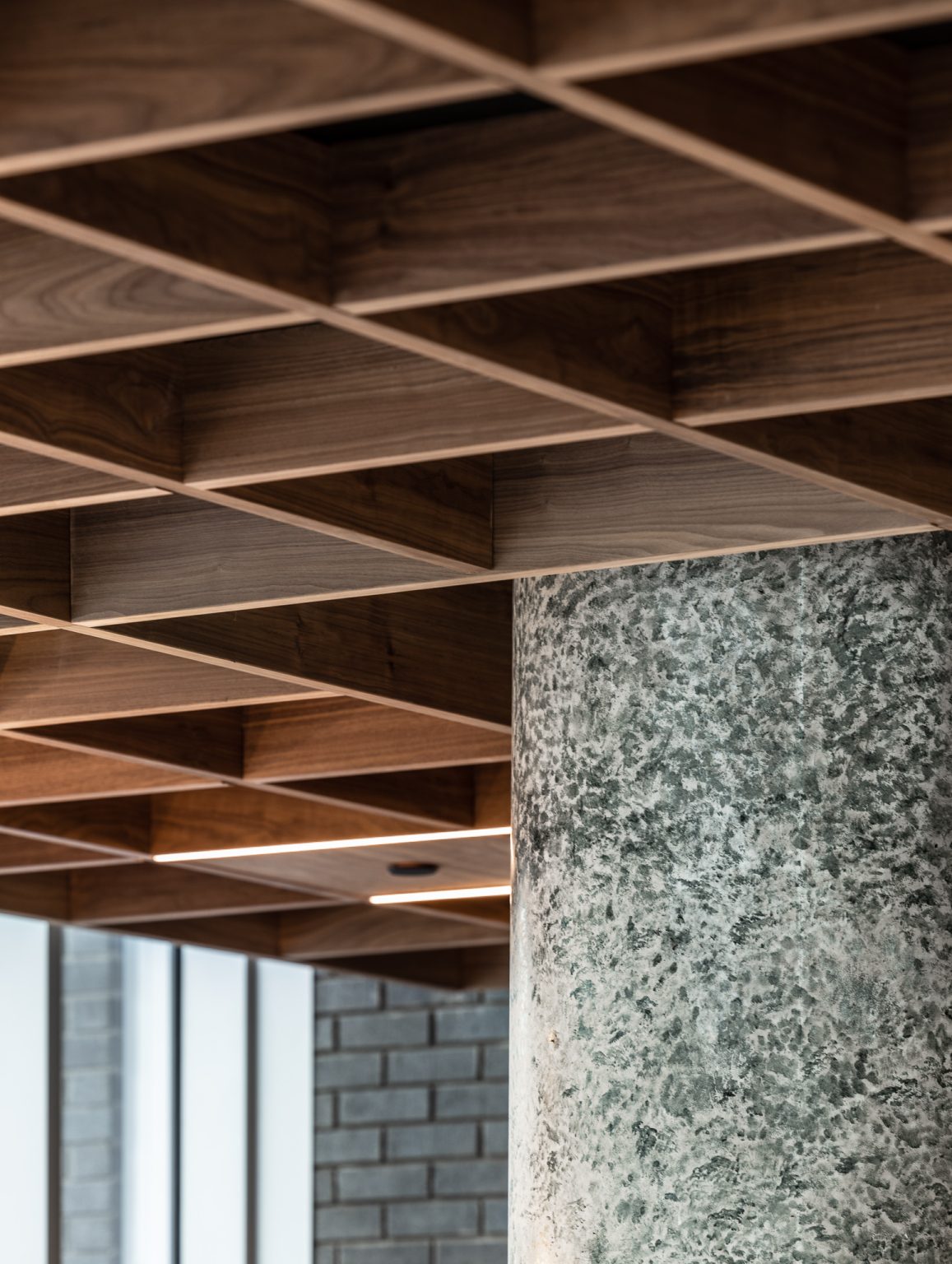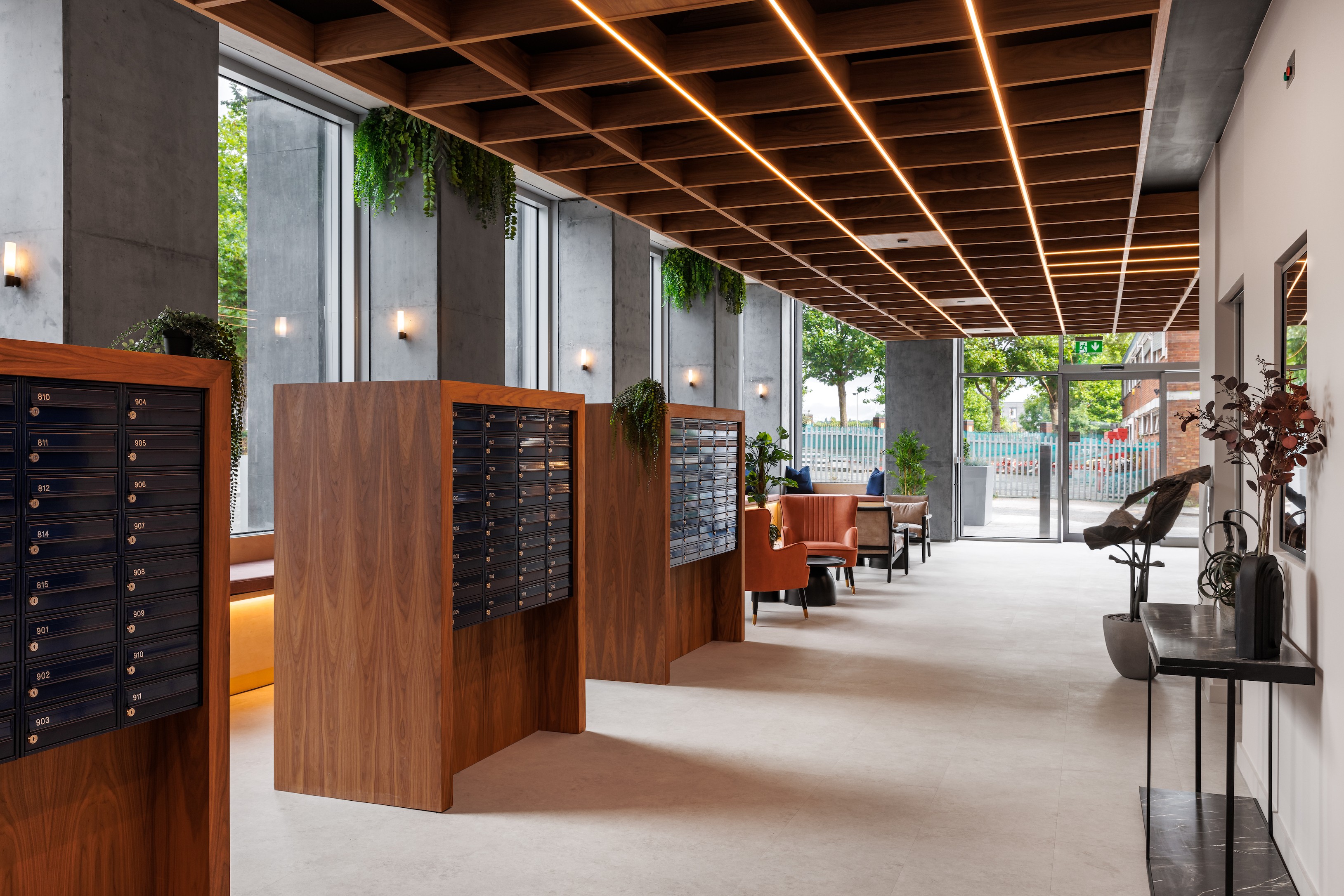 Our scope included the design and installation of a full complement of bespoke joinery elements, most notably a carefully engineered timber waffle grid ceiling, with integrated building and safety services, which provides both visual impact and acoustic performance. Additional works included the installation and commissioning of a luxury cinema room for the residents to enjoy, feature lighting installations, glazed partitioning to denote the gym, yoga studio and business lounge and coworking space, and the sourcing and styling of furniture and décor to complete the scheme and create breakout zones. We also specified wall and floor finishes and provided ongoing design assistance, alongside the architect, throughout the scheme's specification process.