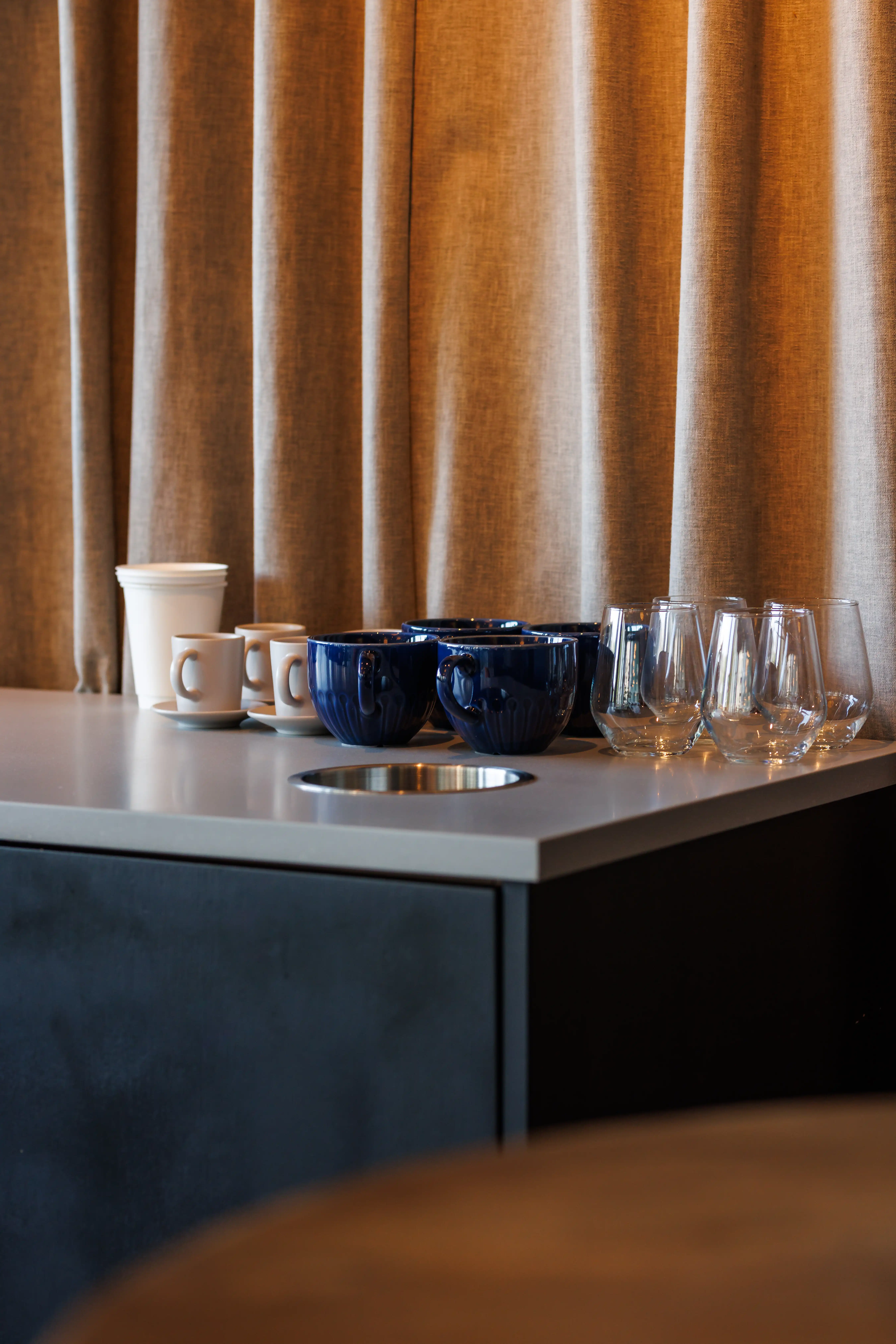 The project included a reimagined layout and contemporary design, new flooring, bespoke wall coverings, acoustic treatments, and fitted joinery that created a window workspace and a coffee station for visitors.