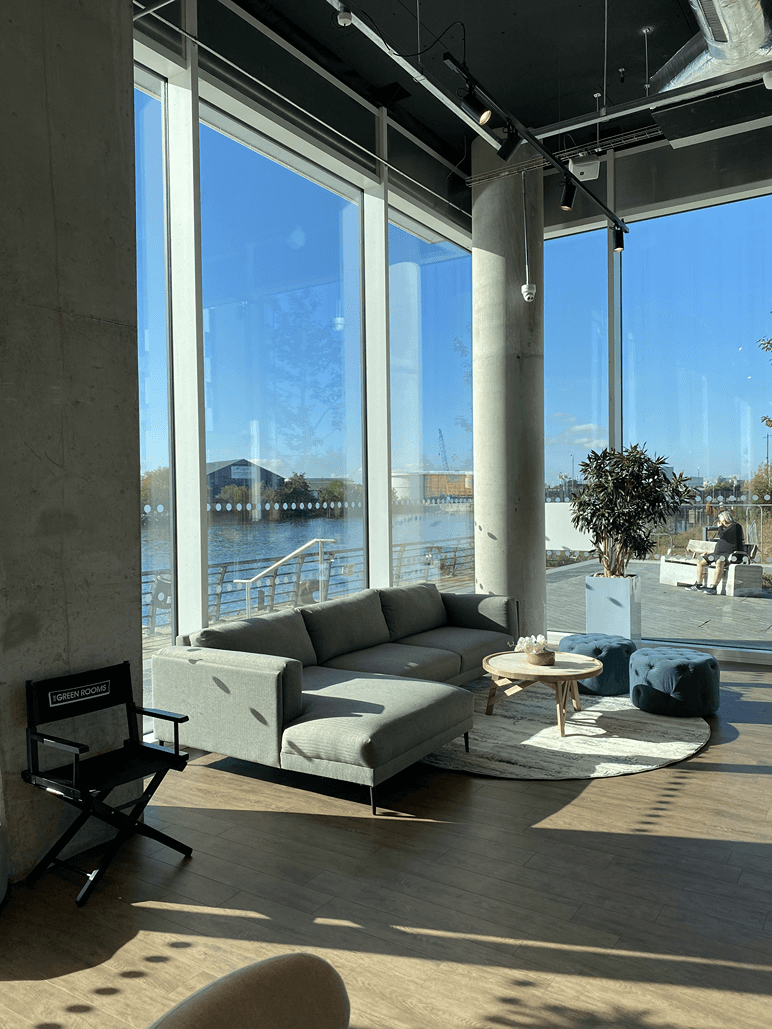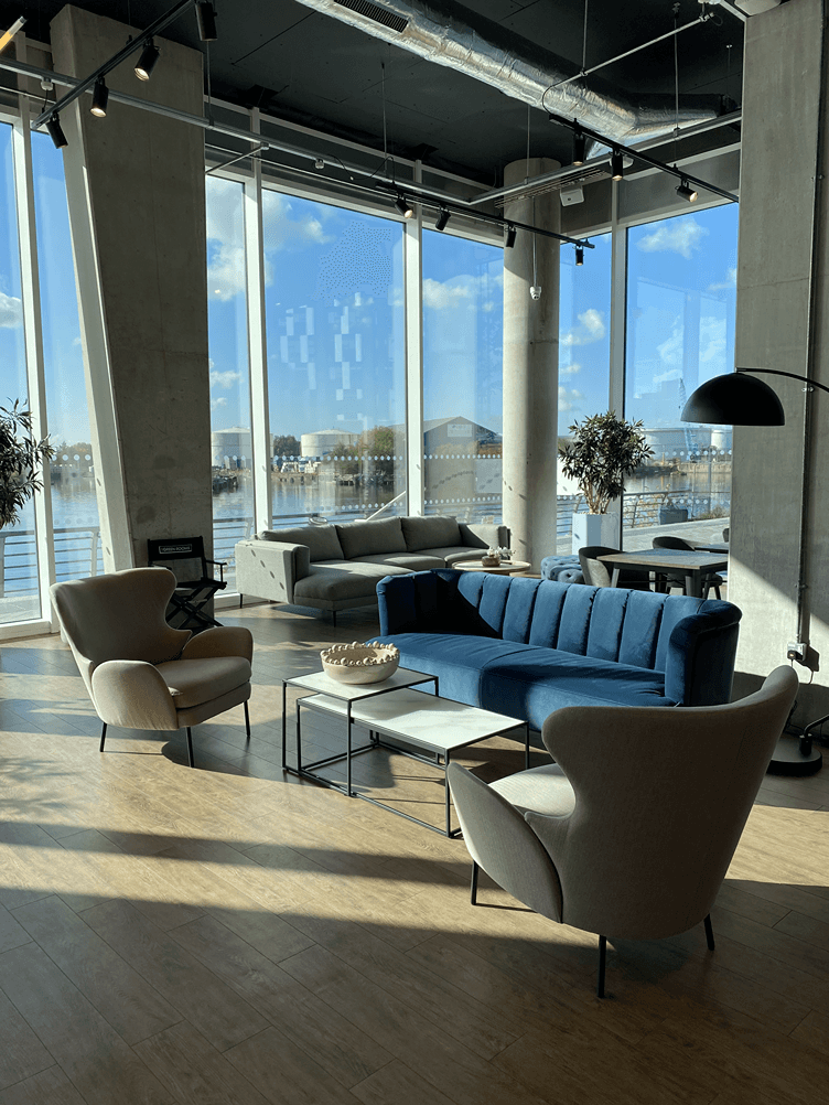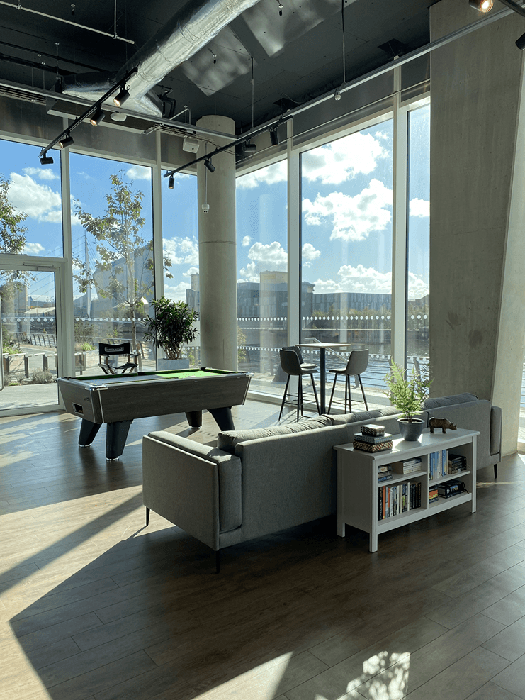We reallocated furniture between the front and rear areas of the building, redefining the large open-plan amenity space to take full advantage of the expansive windows overlooking Salford Quays. The layout was reconfigured to include a social and games area, with added bespoke wall-fixed bar table and custom scoreboard, a modernised co-working zone, and a series of more intimate lounge settings, allowing residents to feel comfortable whether gathering in groups or spending time alone.