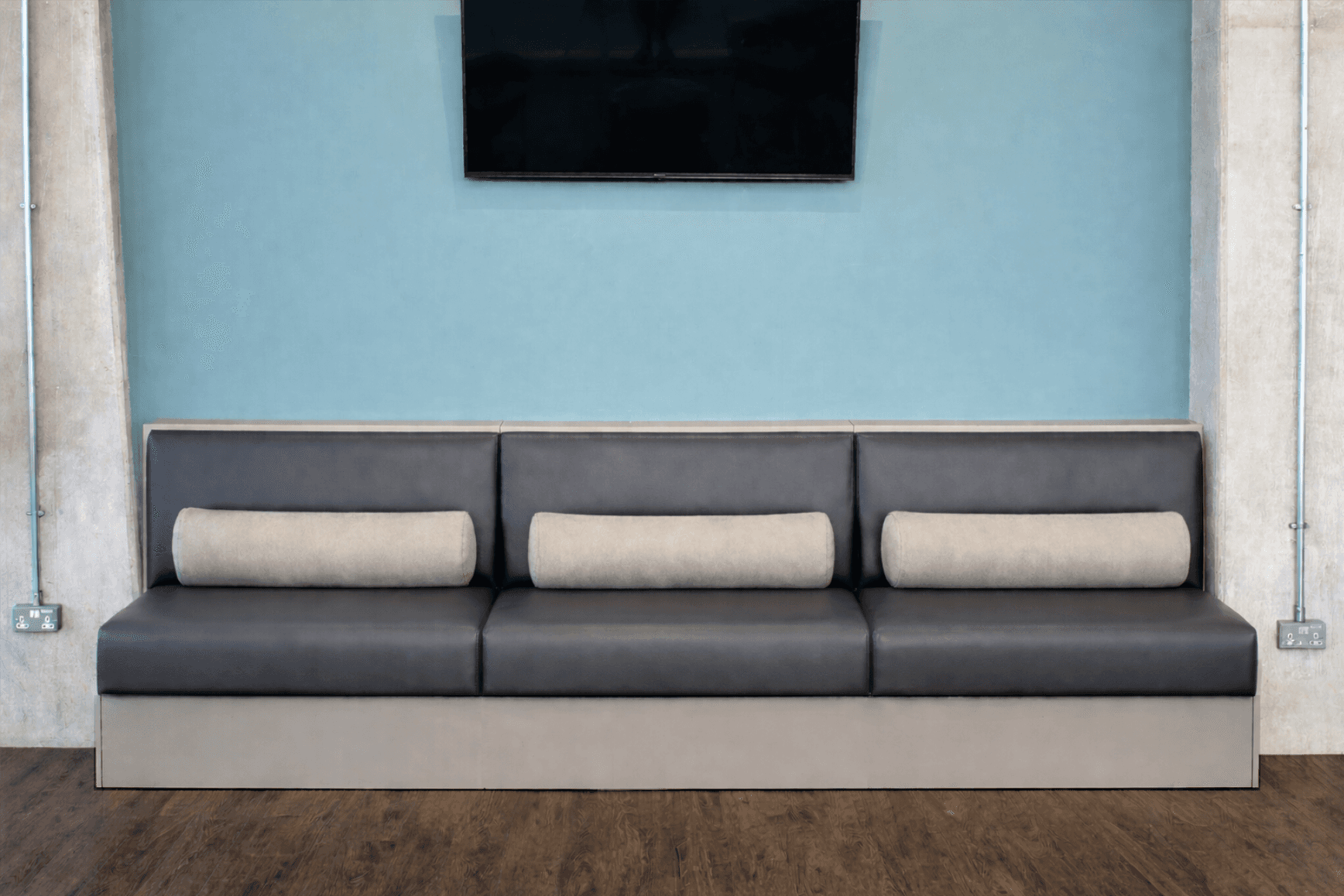 New storage solutions were introduced to improve both functionality and visual cohesion, while lamps, rugs and accessories were layered in to refresh and elevate previously tired areas. The most impactful visual transformation came from refinishing and reupholstering the existing banquette seating, replacing worn, unattractive fabric with a far more durable and refined soft faux leather.