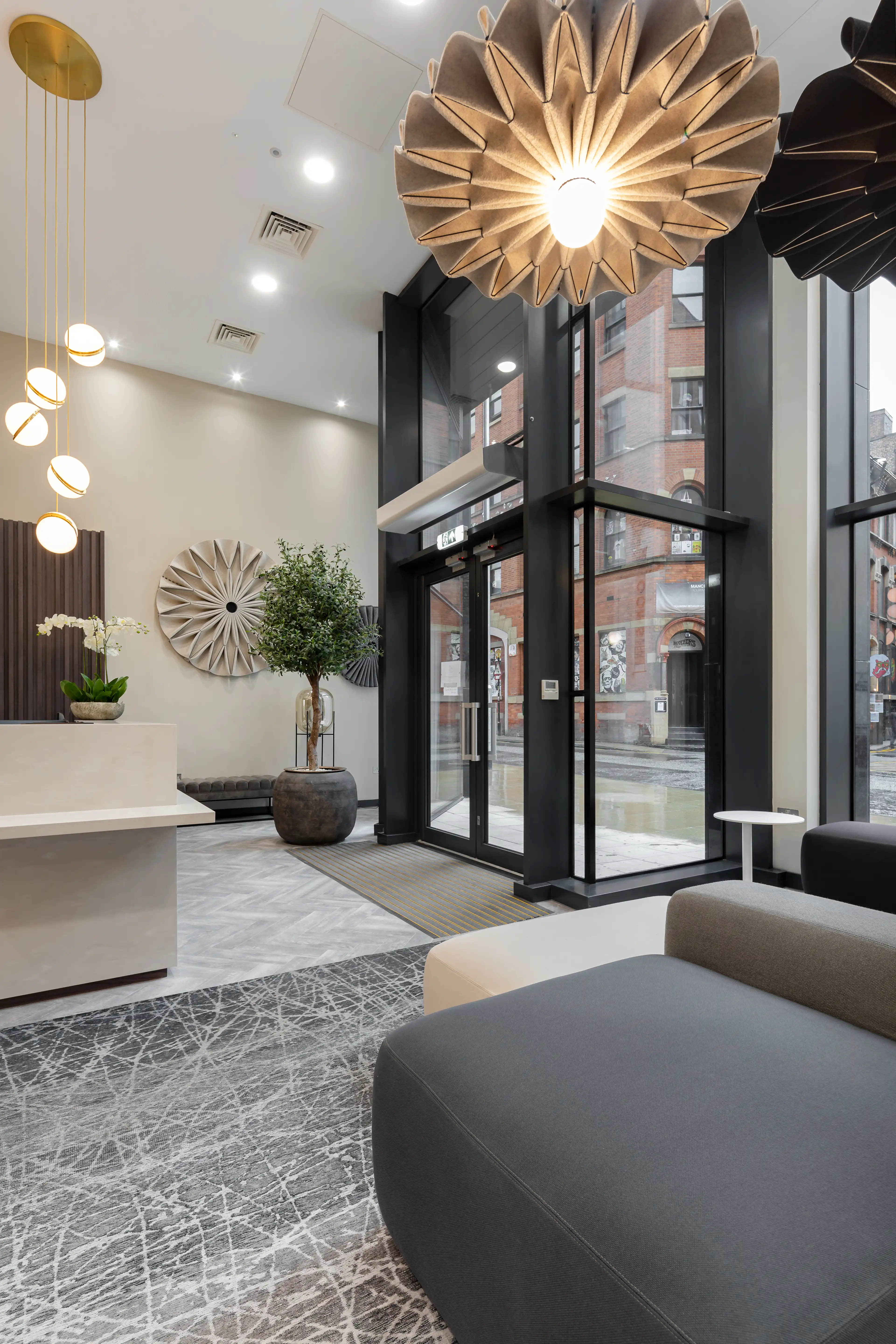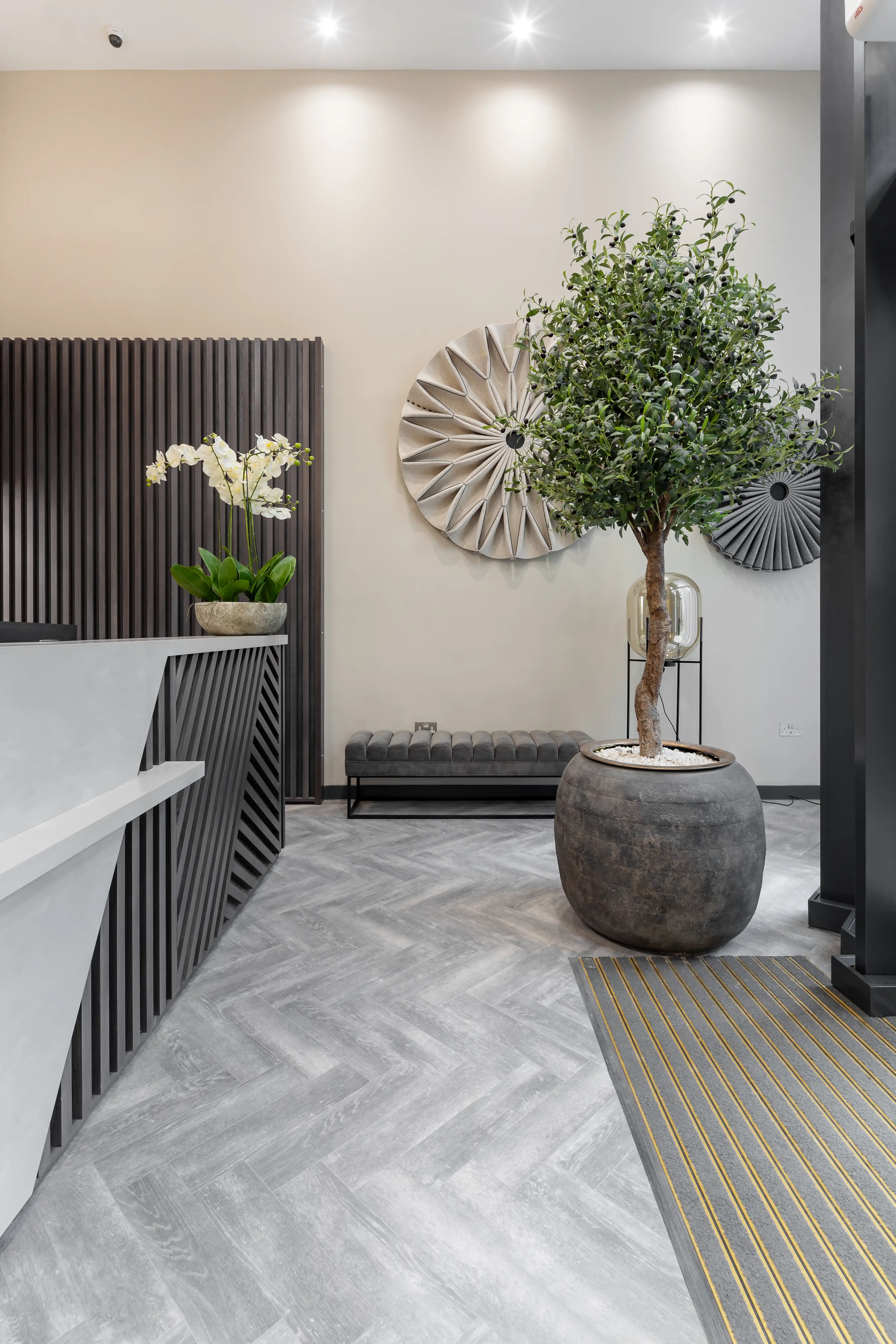 The lobby has been carefully designed to make a strong first impression, combining functionality with a sophisticated aesthetic that reflects the building’s modern identity.