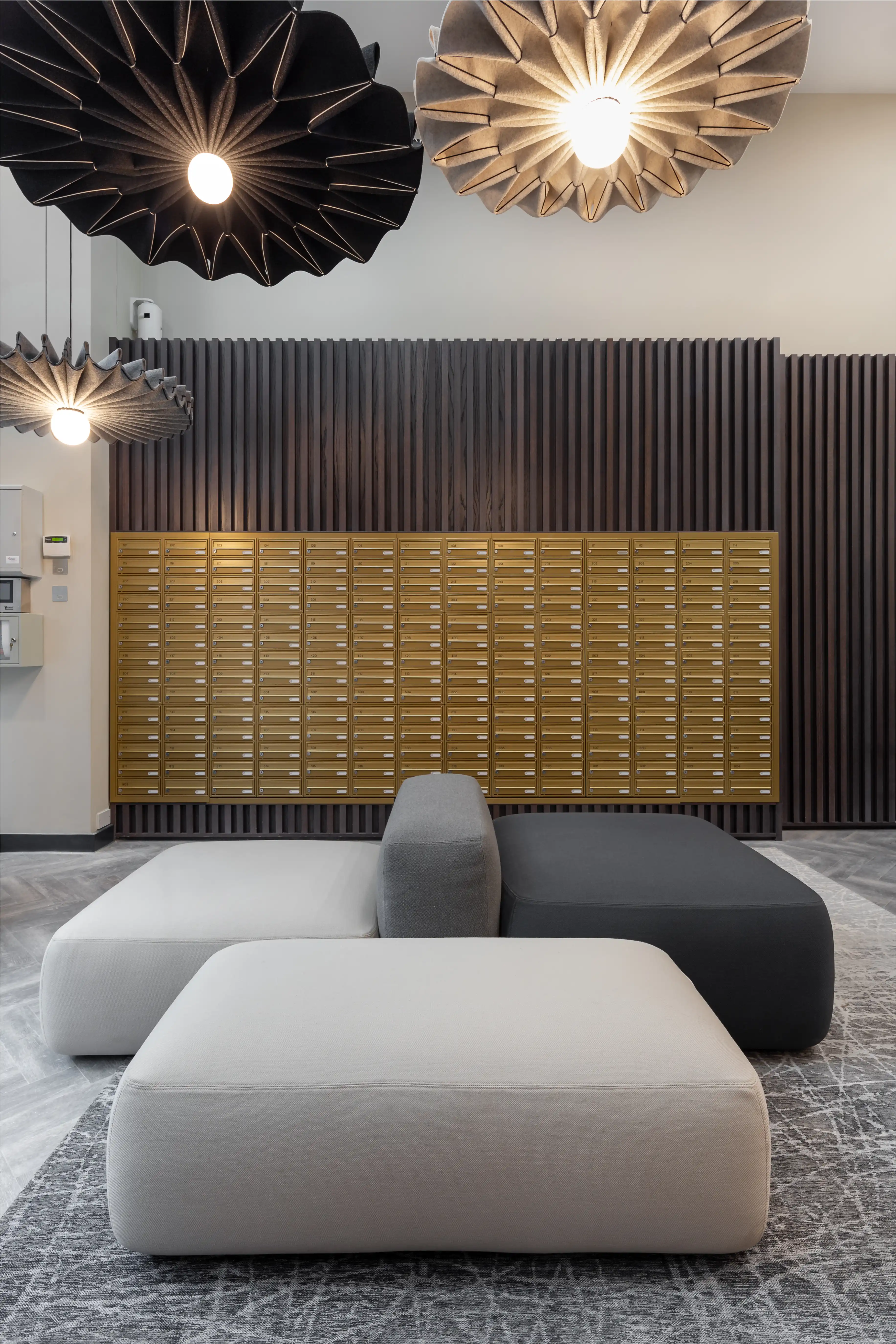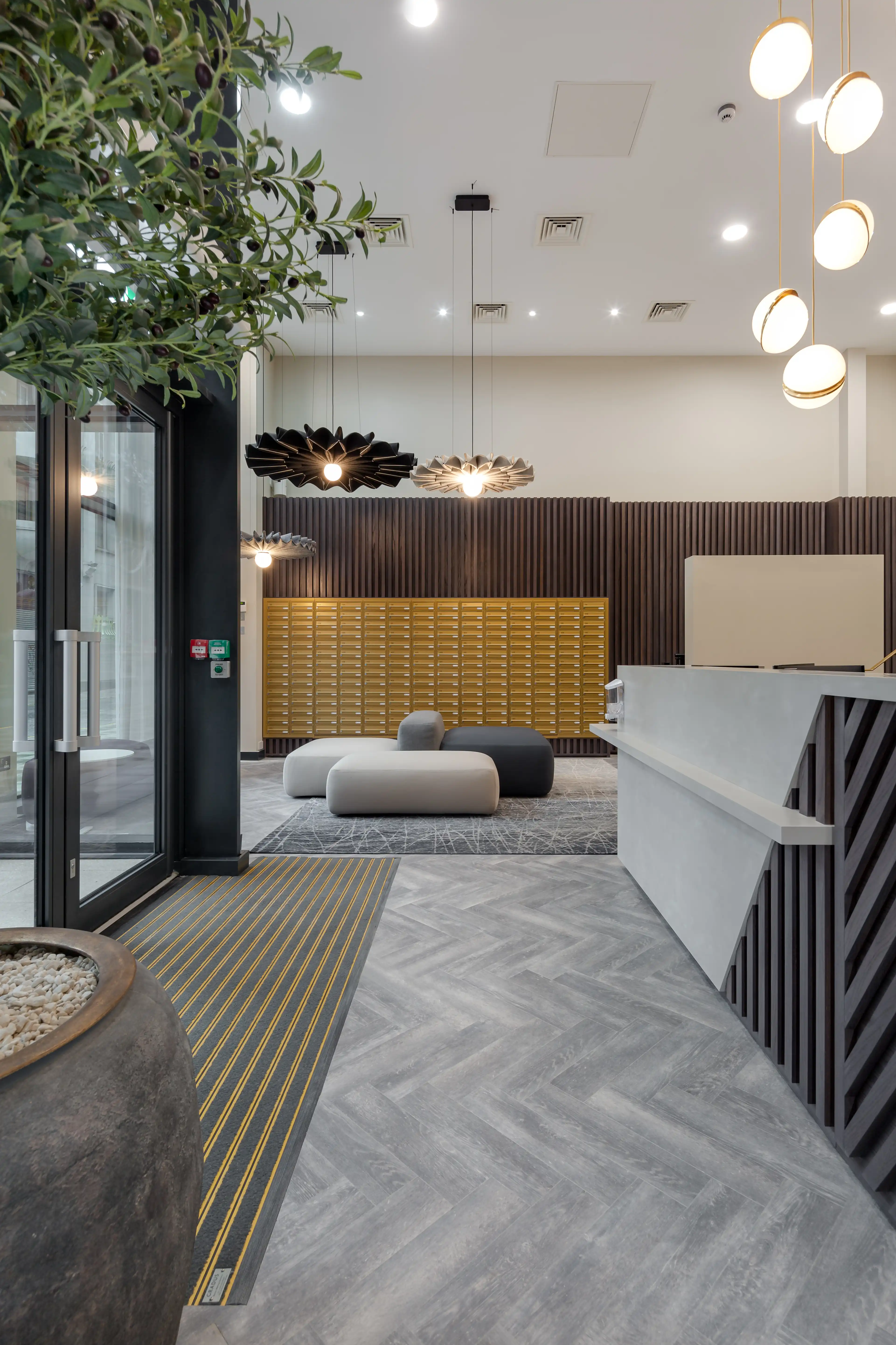 The design balances style with practicality, providing a lobby that not only impresses on arrival but also supports day-to-day use, creating a cohesive introduction to the building and setting the tone for the spaces beyond.